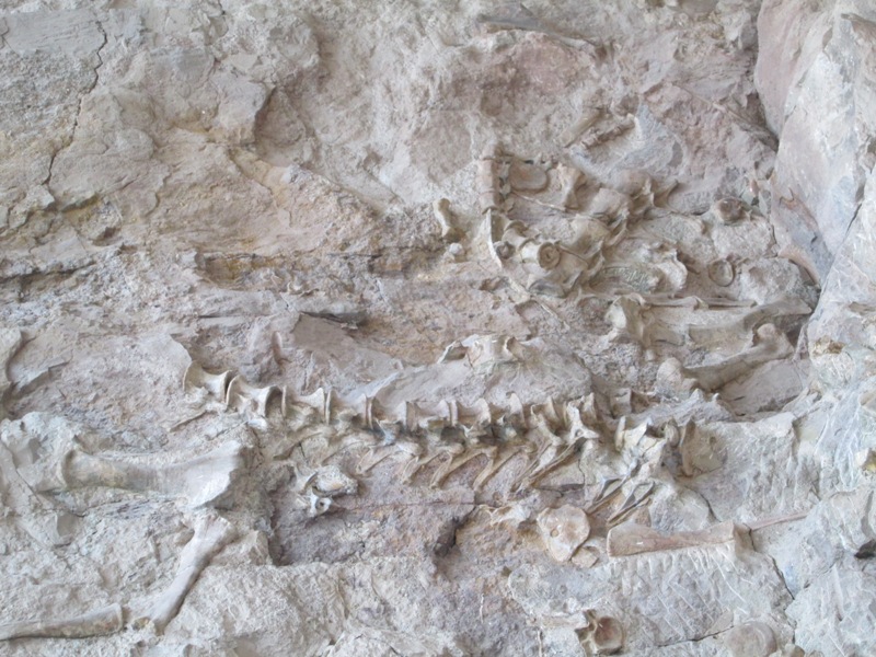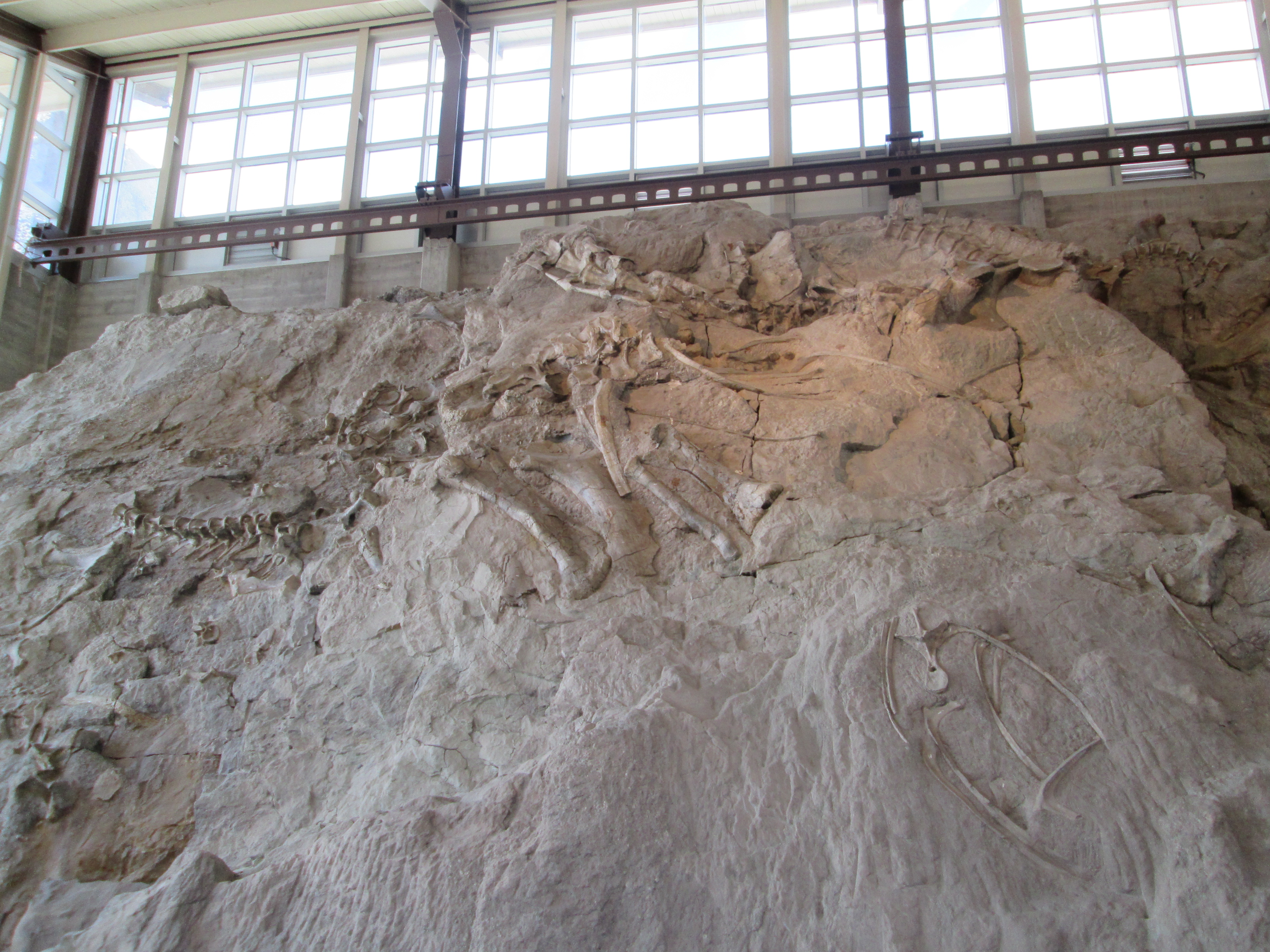 … the main feature of the Quarry Exhibit Hall is a giant wall of rock in which literally hundreds of bones are embedded and clearly visible.