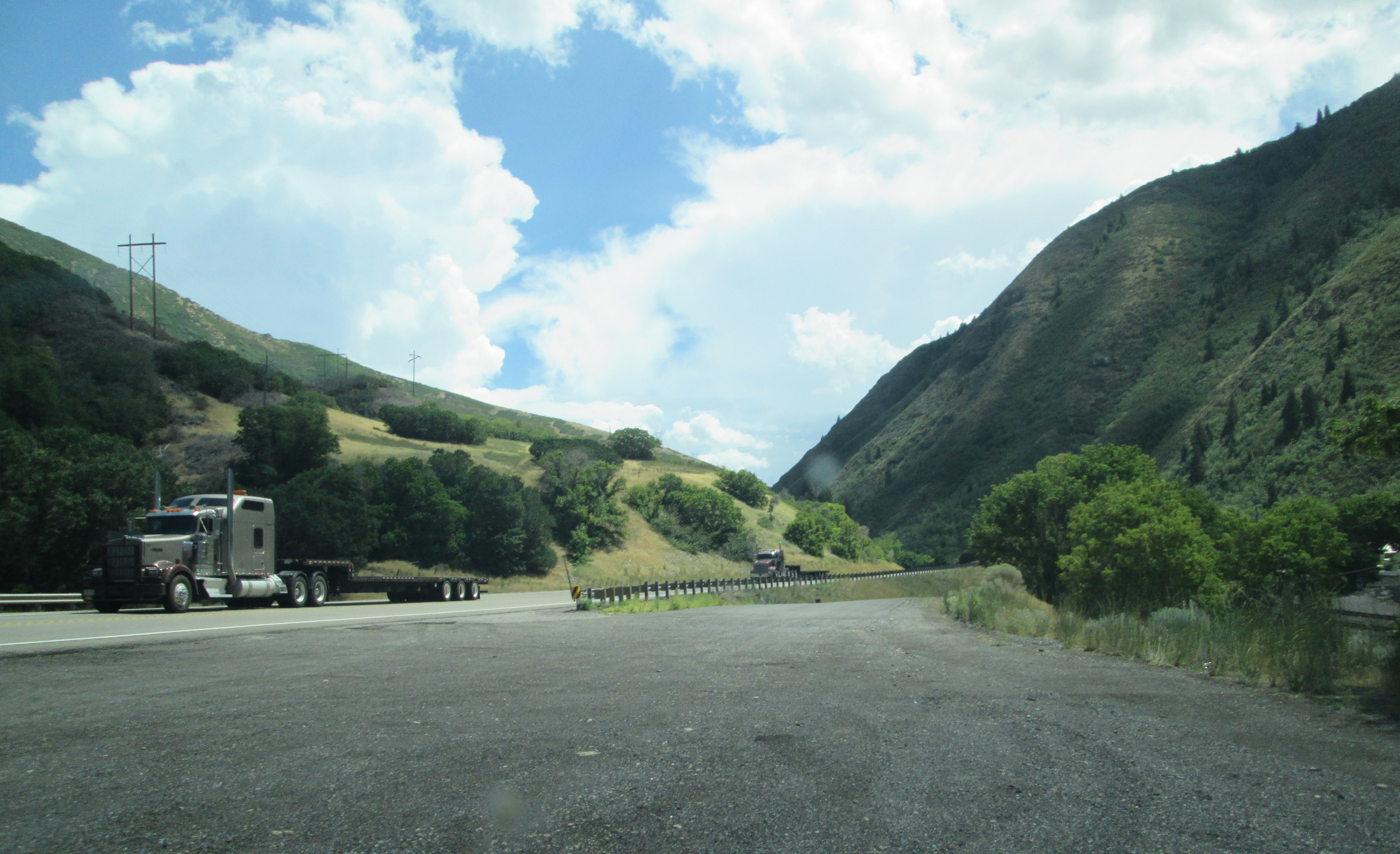 Route 6 east of Salt Lake City – the road leading towards Wyoming, as you can tell by the greener, more tree-filled landscape. There’s far more traffic through here than one would imagine. A truck came barreling down the mountain on me so fast it nearly ran me over! Fortunately I realized the driver wasn’t going to be able to stop in time, and I took advantage of a nearby pullout to get out of the way.