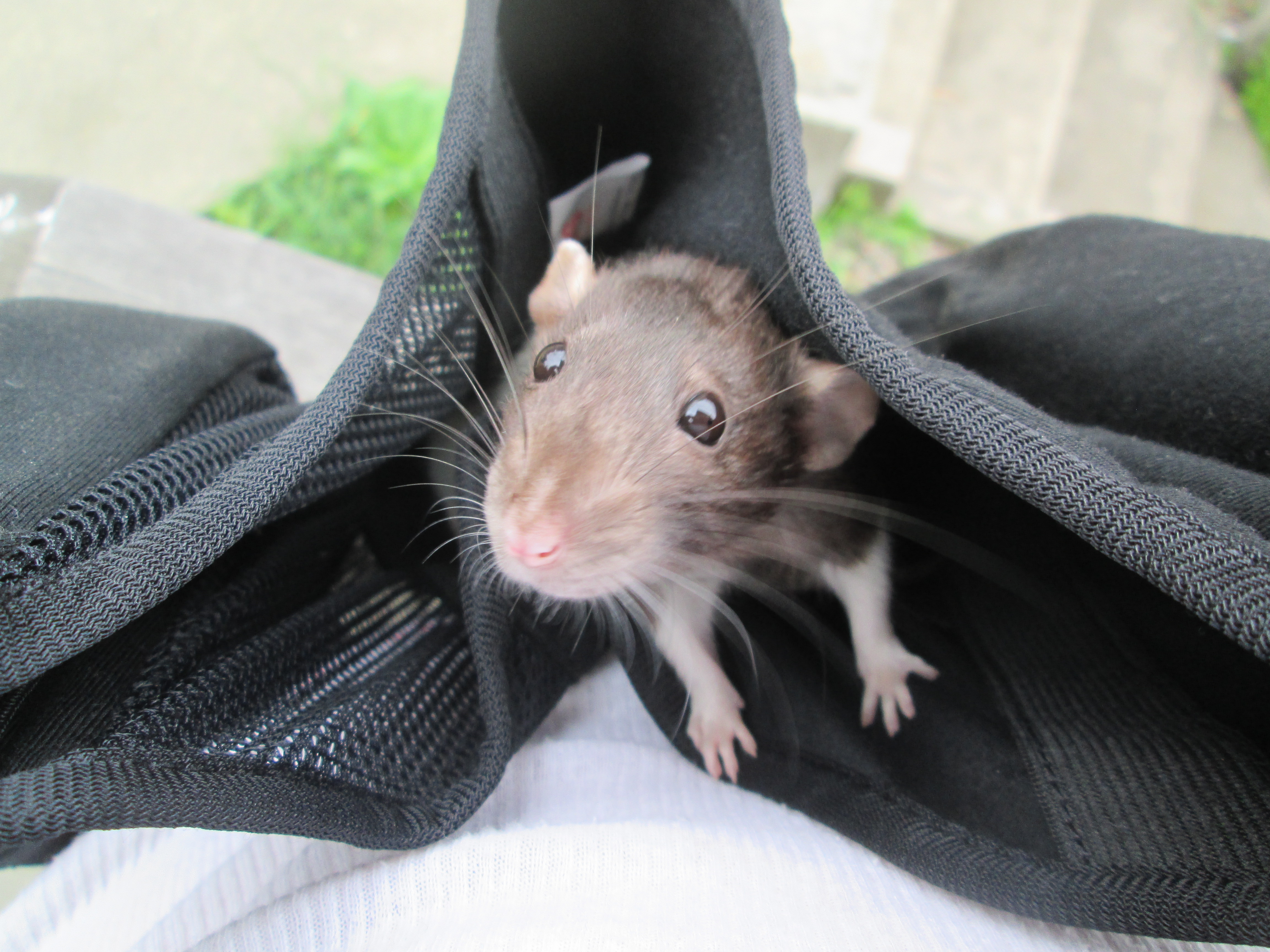 A few times of late I’ve even taken Jane for a walk, tucking her into my now un-needed sling, which drapes nicely around my neck, the perfect support for a rat. I know I’m running the risk of becoming known around town as “crazy rat lady” but I figure, what the heck. I can’t really go anywhere without being able to drive – a walk around the neighborhood is the best I can do. Even just getting outside for a bit makes me feel better. Maybe the fresh air makes Jane better, too.